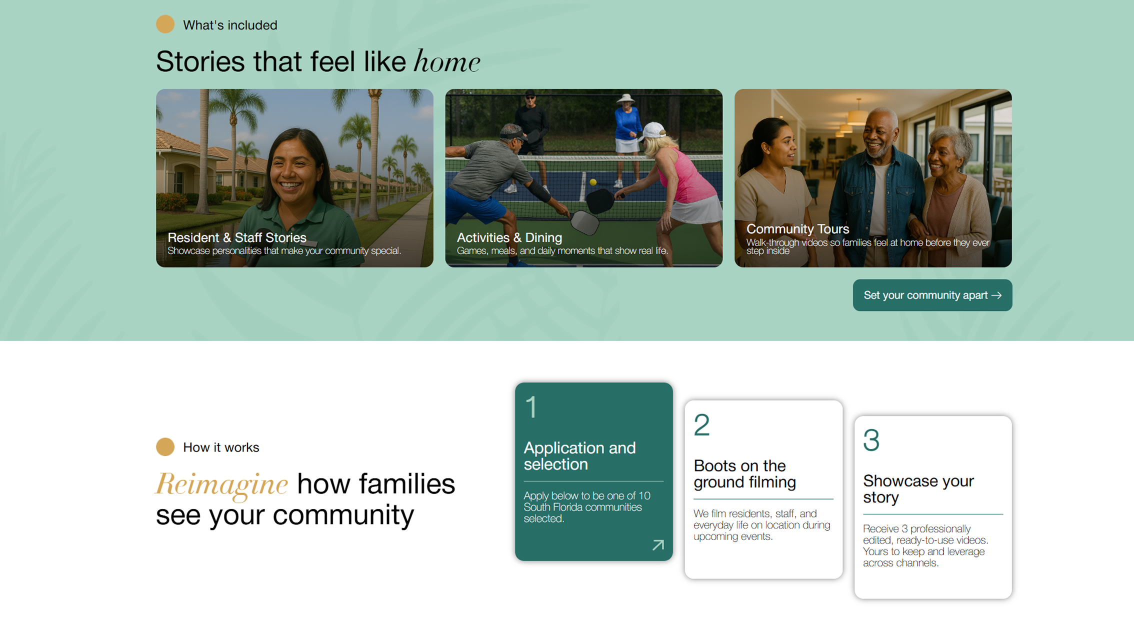 Launched an exclusive pilot program for independent living communities in South Florida through a conversion-focused landing page. The design emphasized authenticity with clear messaging, refined typography, and a modern layout.